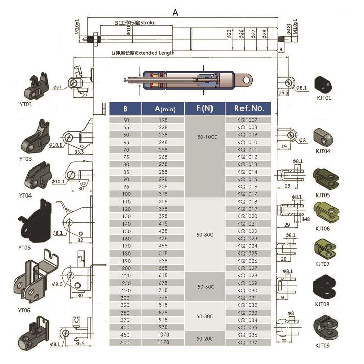 注:由于氣彈簧是非標準的,以上僅為型號的一部分。我們可以根據(jù)客戶的要求定制。
